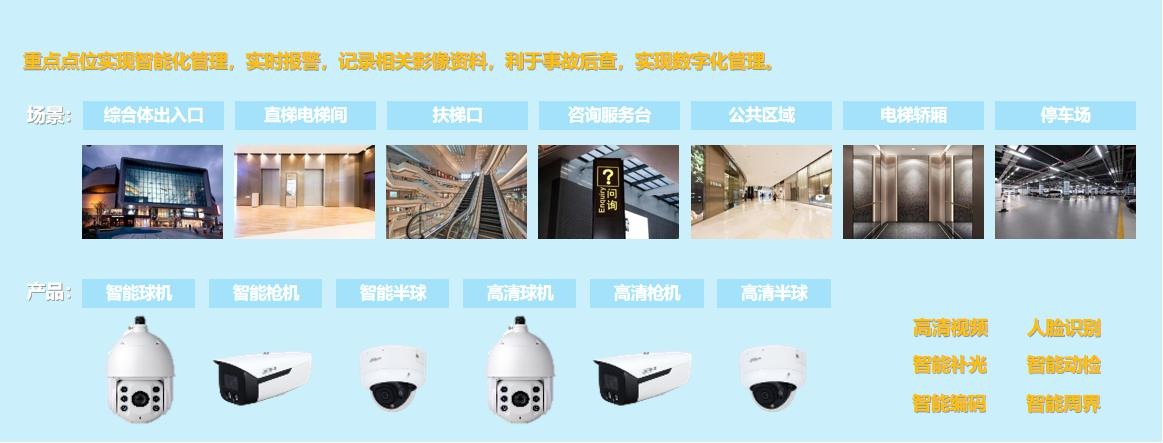完全网络化的视频监控系统(IPVS-IP Video Surveillance),视频从图像采集设备输出时即为数字信号, 以标准Internet网络为传输媒介,基于国际标准TCP/IP协议,采用流媒体技术,实现视频在网上的多路复用传输, 并通过设在中心服务器,完成视频流的转发、报警等操作,以实现整个监控系统的指挥、调度、存贮、授权控制 等功能。此外报警、门禁等前端设备输出的数字信号,也可由多网合一的方式,通过网络复用进行传输,并在同 一平台上进行管理与控制。 基于场景化不同,视频监控部分的功能也有所区别。 商业综合体作为人流量比较大的环境,在基于安全防范的同时需要为运营方提供更多的信息支持,比如客流统计, 人脸识别等基础信息作为运营工作的辅助与提高运行效率的有效方法。 目前公安系统基于对设备稳定的要求,对视频监控的视频清晰度(最低1080P),视频存储时间(公共营业场所 最低90天)都是有比较严格的要求。因此我们在考虑成本的同时需要能同时满足运行,安全及扩展性等方面进行 优化,达到味美价廉,好用,实用,便捷,高效等目的。